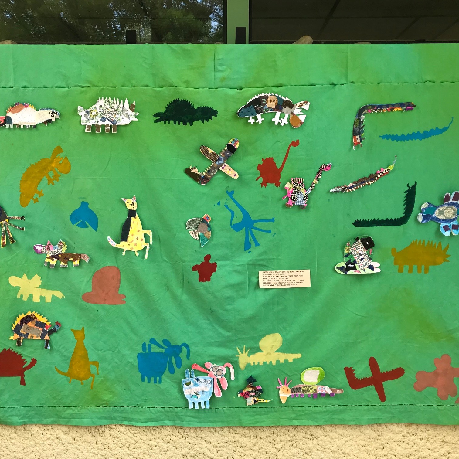 Comme depuis 5 ans, en lien avec le projet de chorale et pour compléter le spectacle de fin d’année, chaque classe illustre ou prolonge une chanson par des propositions plastiques. Cette fois-ci le thème était le monde animal.